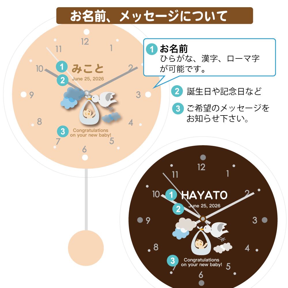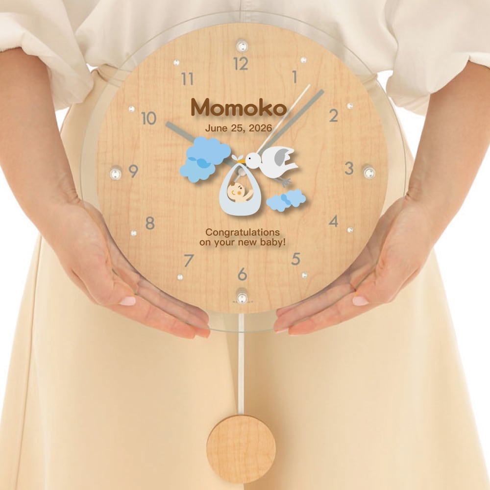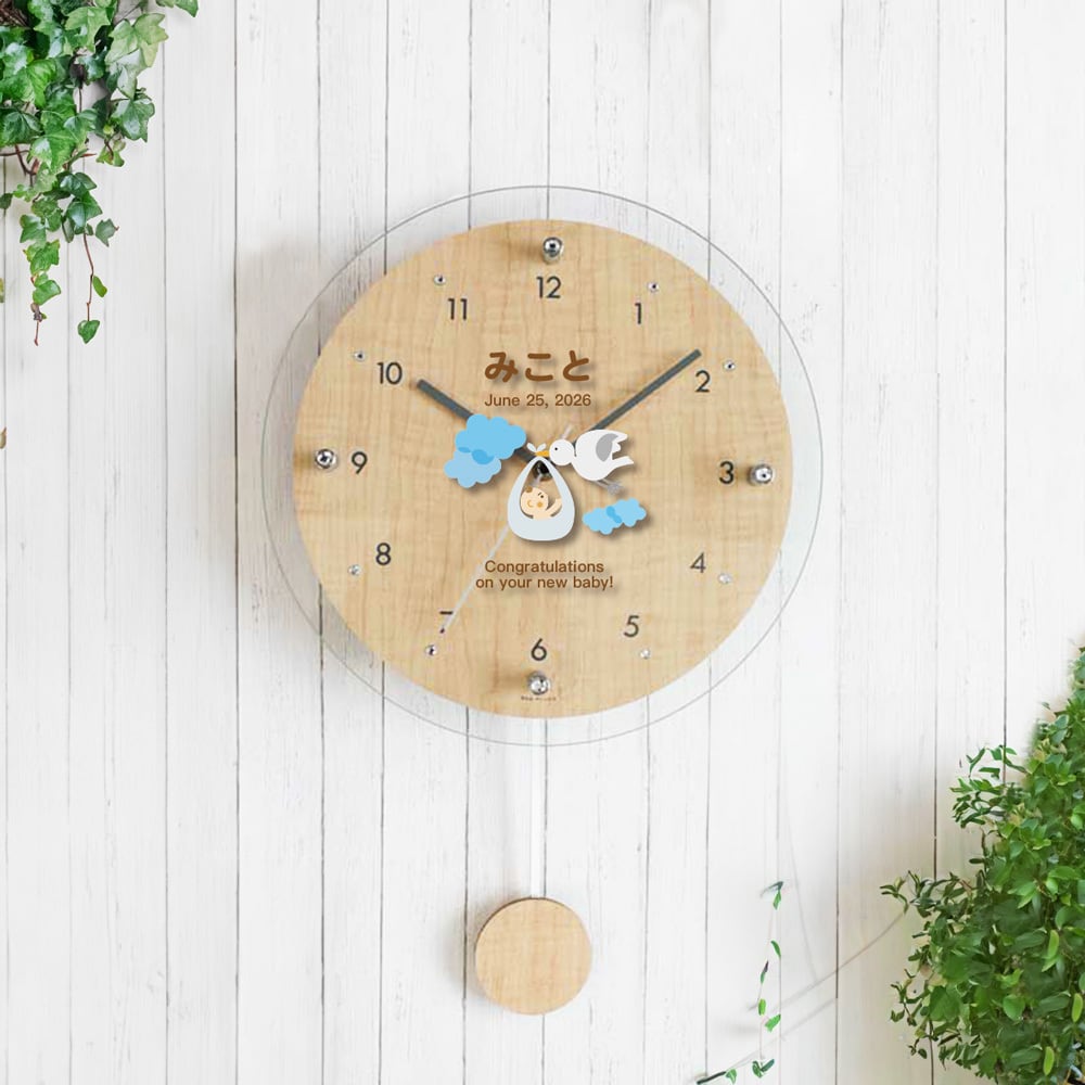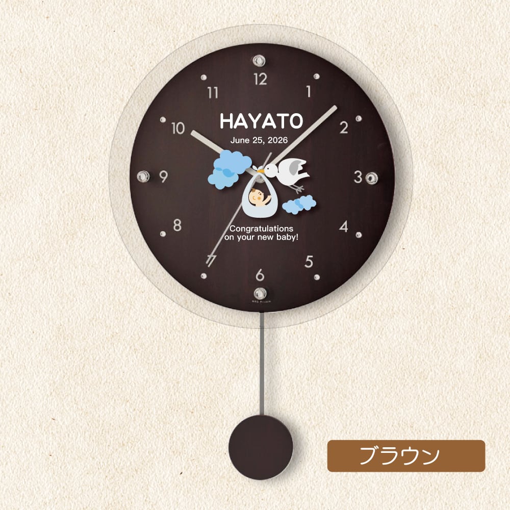 出産祝い お名前入れ 「コウノトリ」 振り子時計 オーダーメイド 送料無料