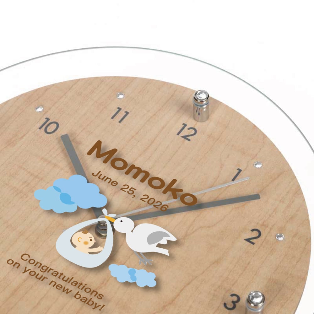 コウノトリが赤ちゃんを運んできました!出産祝いにぴったりの御祝い時計です。